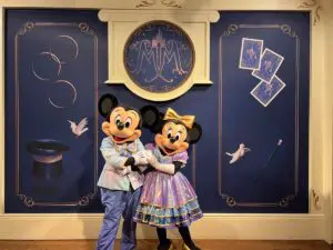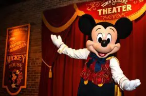 The right room of the Town Square Theater has always been dedicated to Mickey Mouse encounters. Initially, Mickey donned his classic tuxedo outfit, but in 2013, he began wearing an exclusive magician outfit specifically designed for this location. Apart from special events, this magician attire became Mickey’s default costume for meet-and-greets at the theater. Additionally, a talking version of Mickey was introduced in October 2013, following play-testing that started in October 2011. However, in May 2018, Mickey reverted back to the non-talking version.