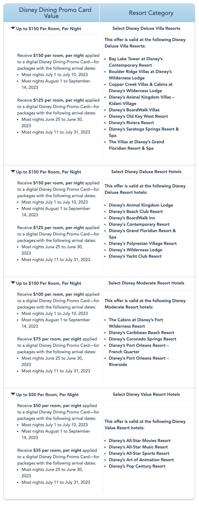 - $750 Disney Dining Promo Card for stays at select Disney Deluxe and Deluxe Villa Resorts. The value of the Disney Dining Promo Card is determined by Disney Resort hotel and length of stay.
